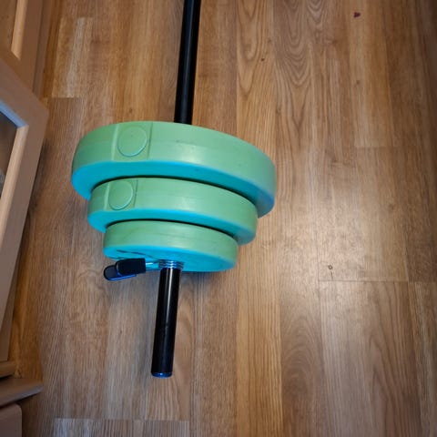 Myynnissä kuvan mukaiset levy- ja kulmatanko kotiharjoitteluun. Levytanko on suora ja soveltuu esimerkiksi kyykkyihin ja maastavetoihin. Kulmatanko sopii erityisesti hauis- ja ojentajaliikkeisiin. Mukana 4 kpl 10 kg painolevyjä.