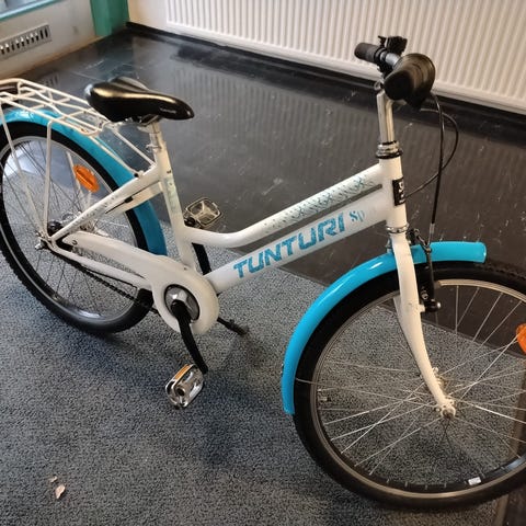 Myynnissä Tunturi Spin polkupyörä. Rengaskoko 24". Jalkajarru takana, käsijarru edessä. Toimiva etuvalo. 7 vaihdetta. Juuri vaihdetut uudet polkimet.