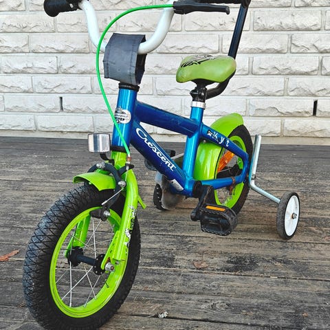 Lasten polkupyörä 12" renkailla. Rungon pääväri on musta ja tehosteväri vihreä. Satula on sininen ja ohjaustangossa on käsijarru. Polkupyörässä on ketjusuoja ja heijastimet etu- ja takapyörässä. Sopii pienelle lapselle ensimmäiseksi polkupyöräksi 12 tuuman kokoluokassa.