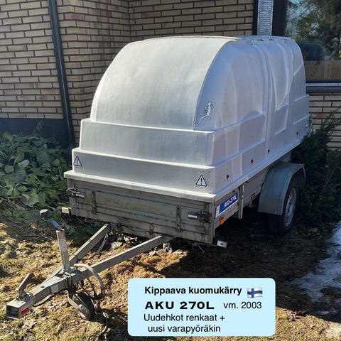 Kotimainen, täysin ruostumaton, alumiininen peräkärry. Lasikuituinen kuomu, joka muovisia kestävämpi ja tarvittaessa korjattavissa.
