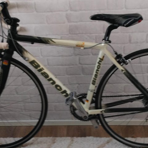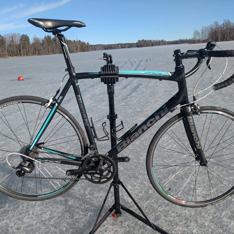 Bianchi maantiepyörä, jossa 50 cm runko ja renkaat 700x25C, lukko polkimet sekä täyshiilikuituinen runko (full carbon).