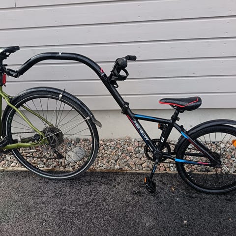 Myydään Merida peräpyörä. Rengaskoko 20", ei vaihteita. Kiinnitys aikuisen pyörän satulatankoon. Mahdollistaa pidemmät pyörälenkit lapsen kanssa ja kätevä esim kaupungissa/vilkkaammassa liikenteessä pyöräilyyn kun lapsi pysyy aikuisen perässä.