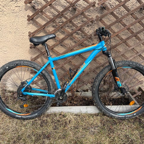 Cube Aim Pro maastopyörä 27.5" -renkailla ja S-kokoisella (16") rungolla. Alumiinirunko. 3x8 vaihteet Shimano Tourney. Hydrauliset levyjarrut. Rungossa on jonkun verran käytön jälkiä ja naarmuja (yläputken naarmut ketjulukosta).