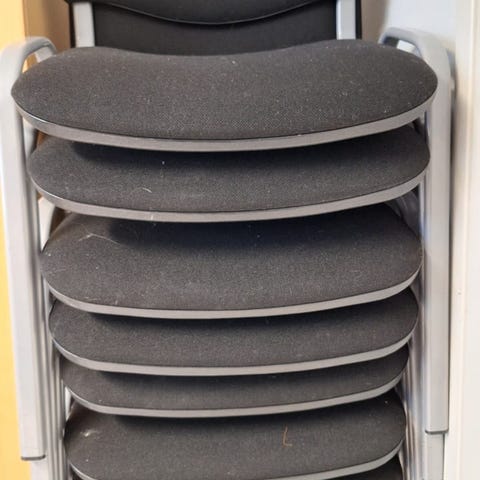 Musta toimistotuoli kangasverhoilulla. Tuolissa on korkea selkänoja ja kiinteät käsinojat. Istuinkorkeus on säädettävissä kaasujousella. Jalusta on viisisakarainen ja valmistettu metallista, alla pyörät liikkumista varten. Sopii työpöydän ääreen kotitoimistoon tai muuhun sisäkäyttöön.