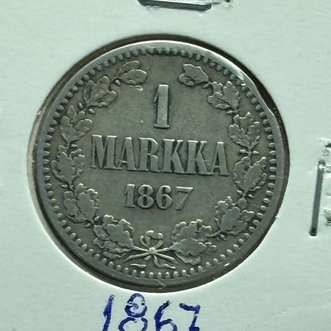 Suomen markka 1 markan hopearaha vuodelta 1864. Kolikon toisella puolella teksti "1 markka" ja vuosiluku 1864, reunaa kiertävä lehväkoriste. Toisella puolella vaakuna ja reunateksti, jossa maininta hopeapitoisuudesta. Soveltuu keräilyyn historiallisena suomalaisena rahana.