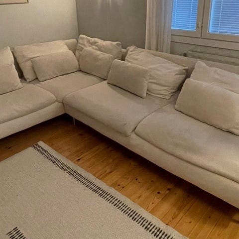 Sohva on hyvässä kunnossa sohvatyynyineen. Sohvan rungossa on mustia labradorinnoutajan karvoja. Kuten kuvasta näkyy, on sohvan kaikki osat pesty viikon sisään, mutta eivät pysy puhtaana koiran kanssa. Pesen vielä uudestaan tyynyt. Ollut noin 2 vuotta käytössä. Käsinojan ostin syksyllä ja valkoiset päälliset vuosi sitten. Aikaisempia ei ole tallessa.