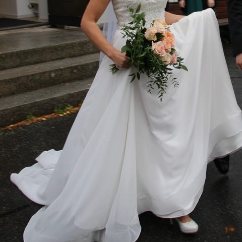 Sis Idman Chanel -hääpuku koossa S. Ompelijalla lisätty silkki-organza hihat, lyhennetty helmaa ja pienennetty kädenteitä hieman. Morsiamen pituus on 154 cm + 5 cm korot.