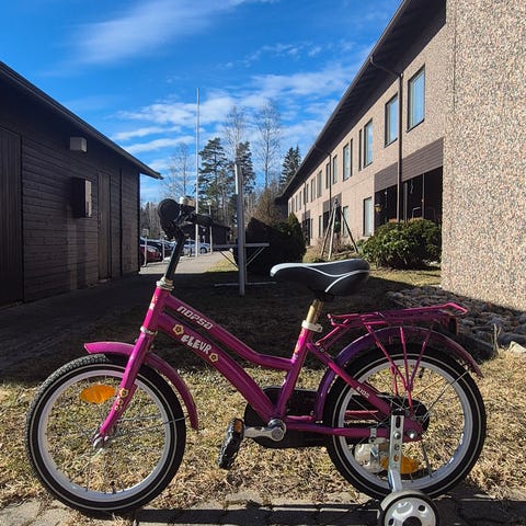 Lasten polkupyörä, jossa 16" renkaat. Pyörässä on ketjusuoja, lokasuojat, seisontatuki/ jalka sekä tavarateline. Käsijarru etupyörässä ja jalkajarru takana.