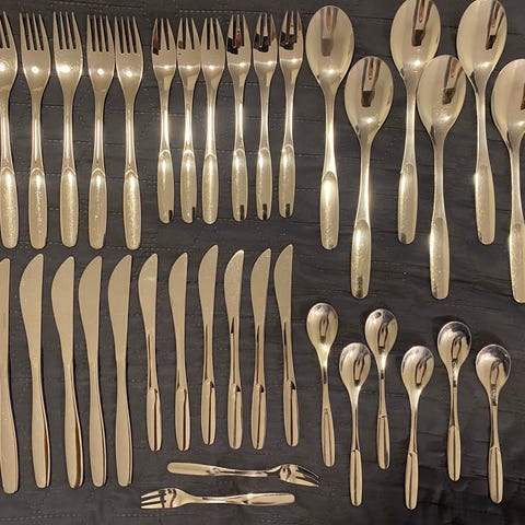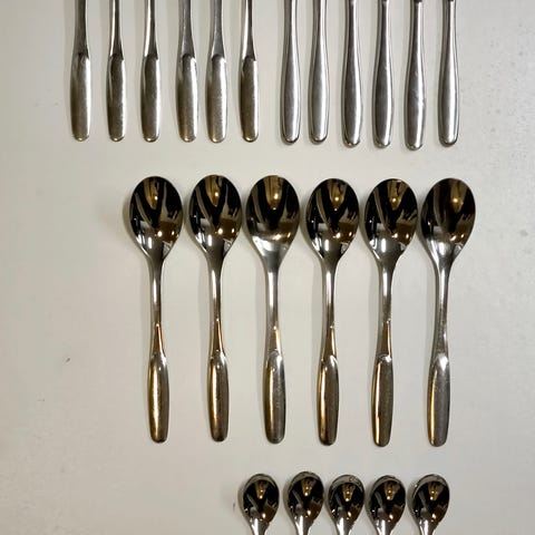 Hackman Savonia malliston aterimet, jotka sisältävät erilaisia lusikoita, haarukoita ja veitsiä. Sisältää:12 kpl kahvilusikka6 kpl jälkiruokalusikka6 kpl ruokalusikka6kpl ruokahaarukka6 kpl veitsi1 kpl kakkulapioAterimet ovat tunnettuja yksinkertaisesta ja ajattomasta muotoilustaan.
