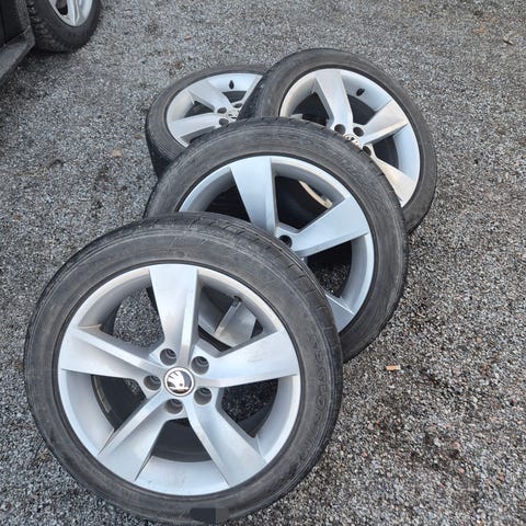 Kuvien skodan alkuperäiset vanteet 215/45r16 Dunlop kesärenkailla 3-5mm pintaa. Vanteet sisitikuntoiset, muutamassa puolassa pieniä jälkiä kun päässyt ilmeisemmin kaatumaan naamalleen maahan.