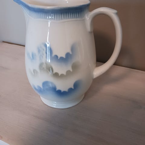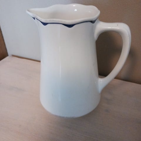 Arabia Pekkakannu valkoinen sinisellä reunakoristeella keramiikkaa