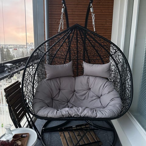 Hyväkuntoinen musta riipputuoli, jossa metallinen jalustarunko ja istuinosa. Istuinosassa on musta punosrakenne ja erillinen pehmustettu istuintyyny selkänojalla. Tuoli soveltuu käytettäväksi esimerkiksi parvekkeella, terassilla tai sisätiloissa. Säilytetty lasitetulla parvekkeella. Rungon saa kahteen osaan kuljetusta varten. Merkki 4living.