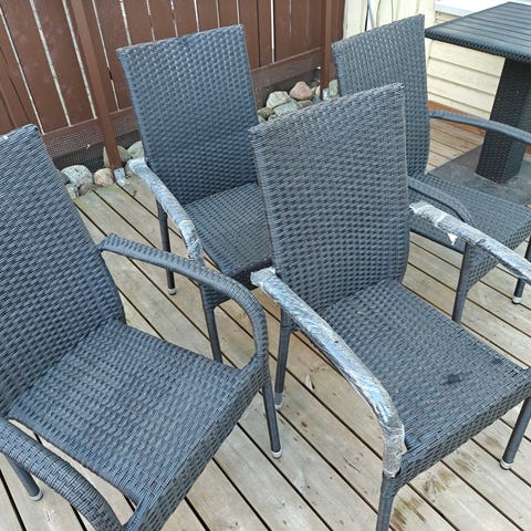 2 kappaletta tyylikkäitä Envy Kaja polyrottinkituoleja. Päälliset irrotettavissa. Muutaman vuoden vanhat, olleet meillä ulkona terassikäytössä. Talveksi otettu lämpöiseen varastoon. Siisti käytetty kunto, mutta toisen tuolin jaloista maali irtoillut (tämä vain kosmeettinen haitta).