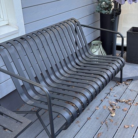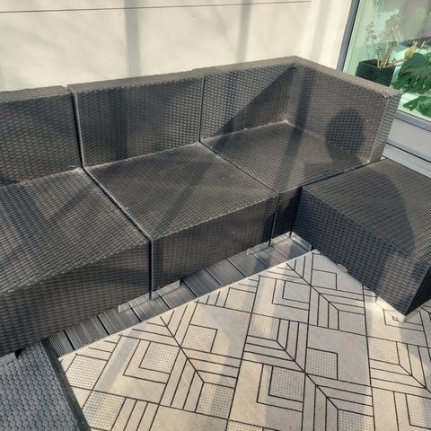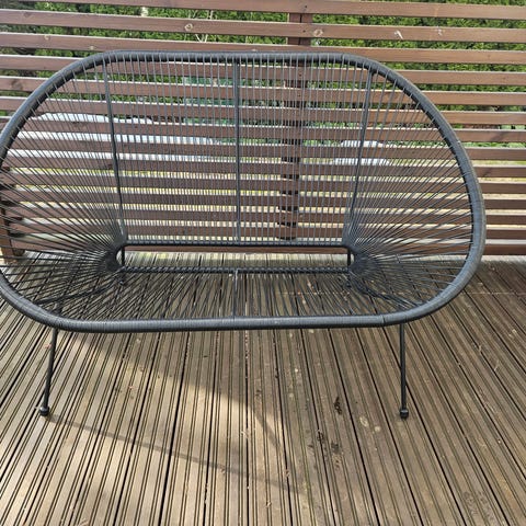 Polyrottinkinen 2-istuttava terassisohva. Sohvassa on harmaa punottu runko ja irrotettavat istuin- ja selkänojatyynyt harmaalla päällisellä. Korkeat käsinojat ja hieman taaksepäin kallistuva selkänoja tukevat istuma-asentoa. Sopii parvekkeelle, terassille tai puutarhaan ulkokäyttöön. Säilytetty lasitetulla parvekkeella. Istuinpehmusteessa on noin 8 cm repeämä saumassa (näkyy kuvassa 5). Pehmusteet sisältyvät hintaan. Pehmusteiden sisätyynyt hieman hapertuneet, mutta edelleen käyttökelpoiset.