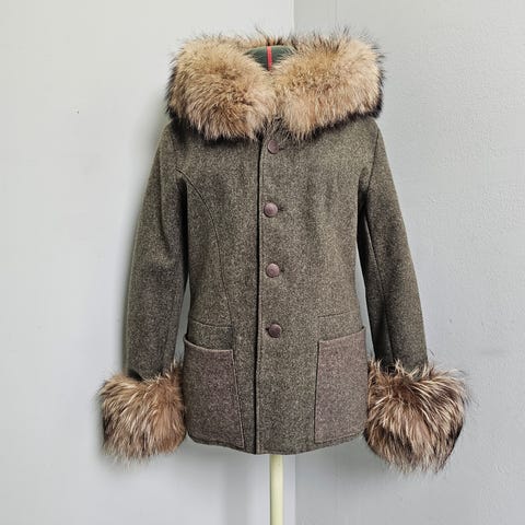 Condition: The jacket has been well-loved. There is some noticeable peeling/cracking on the metallic finish around the collar area and on the grey trim of the pockets (please see the last few photos for details). Otherwise, the zippers and fur are in great shape.