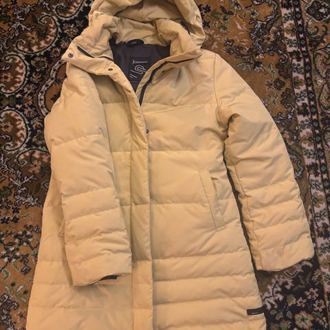 Joutsen naisten ulkotakki, koko 38. Väriltään kulta ja materiaalina nahka. Takissa on tikattu pinta ja edessä vetoketjukiinnitys. Useita vetoketjutaskuja edessä. Hupussa on karvareunus. Sopii naisten ulkoilukäyttöön ja arkivaatteeksi viileämpiin säihin.