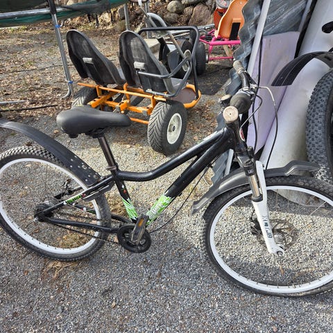 Lasten polkupyörä, jossa 24" renkaat. Runkoväri turkoosi ja lokasuojat sekä tavarateline valkoiset. Pyörässä on matala runko helpottamassa kyytiin nousua, etukori pientä kuljetusta varten, heijastimet ja seisontatuki. Soveltuu noin 24"-kokoista pyörää käyttävälle lapselle tai nuorelle arkiajoon ja koulumatkoille.