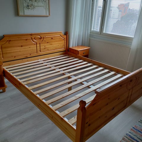 Kiteen huonekalutehtaan sänky ja kaksi yöpöytää. Todella siistit, ei minkäänlaisia jälkiä.