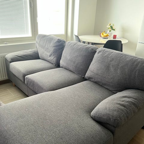Kuvien mukainen kunto, vajaa 4 vuotta käytössä ollut sohva. Päällisissä joitain tahroja, vaativat pesua. Divaanin puolta saa vaihdettua.