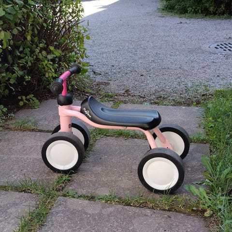 Seuraavalle potkuttelijalle Puky LR 1 -potkupyörä. Käytön jälkeä on, mutta teknisesti kaikki toimii kuten pitääkin. Renkaat pitävät hyvin ilmaa. Sopii yli 90cm lapselle.