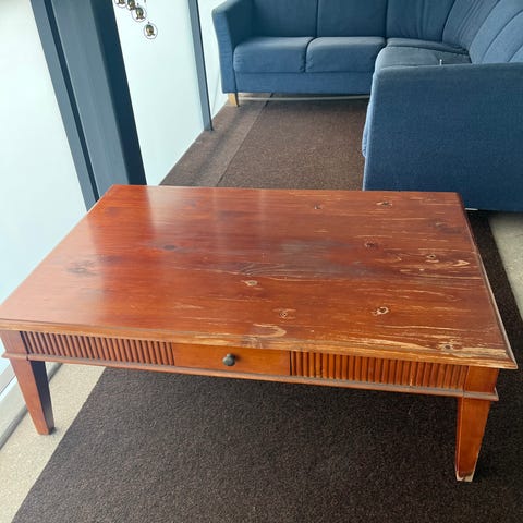 Kirsikan värinen puinen sohvapöytä. Käytönjälkiä pinnassa, mutta ihan ehjä ja siisti.