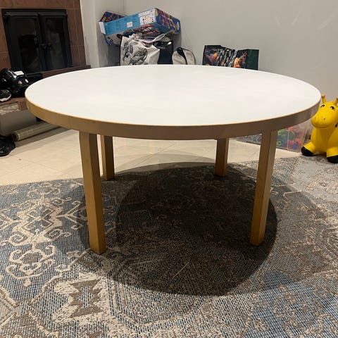 Artek lastensetti, johon kuuluu pöytä ja kaksi tuolia. Kalusteet on valmistettu vaaleasta koivuvanerista, jossa on luonnollinen puunsävy. Pöydän ja tuolien kansi on valkoinen ja sileäpintainen, ja jalat ovat taivutettua koivuvaneria. Tuoleissa on matala selkänoja ja tukevat jalat, jotka sopivat lasten käyttöön. Setti soveltuu esimerkiksi lastenhuoneeseen piirtämis- ja leikkipöydäksi tai pieneen oleskelutilaan lapsille.