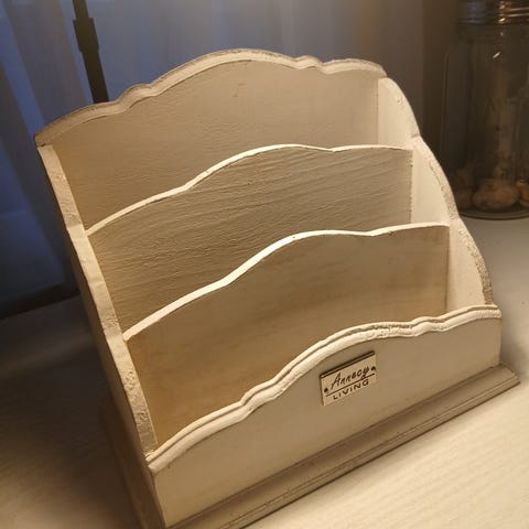 Kaunis kirjatuki, esim keittiöön reseptikirjalle tai muiden tavaroiden, esim postin säilytykseen. Tukijalan kanssa pysyy tukevasti pystyssä. Lev 30cm , kork n 36cm, syvyys n 10 cm