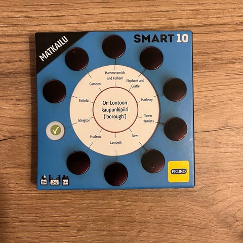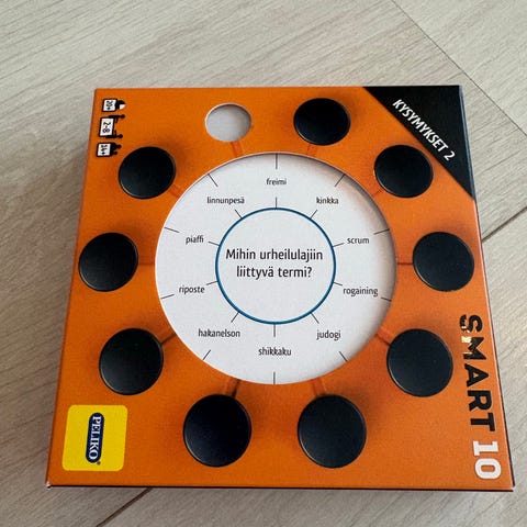 Smart10 tietovisapeli lisäosalla. Peli sisältää 200 kysymystä ja 2000 mahdollista vastausta. Pakkaus sisältää myös lisäosan, jossa on lisää kysymyksiä pelattavaksi. Sopii useammalle pelaajalle ja erilaisiin tietovisoihin koti- ja vapaa-ajan käyttöön.