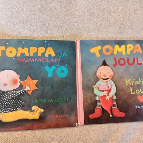 Kristiina Louhen hyväkuntoinen Tomppa-kirja, kansissa vähän ajan patinaa.