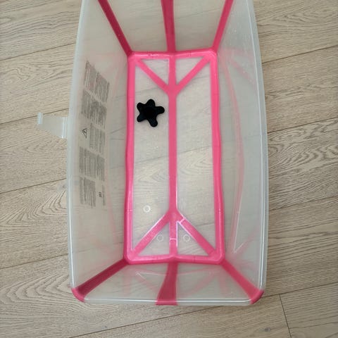 Stokke lasten kylpyammeen osat. Tuotteet ovat kokoontaitettavia ja valmistettu muovista, runko-osissa näkyy tukirakenteet ja kiinnikkeet. Sopivat käytettäväksi osina Stokke-lastenkylpyammeessa tai vastaavassa järjestelmässä, jossa tarvitaan kokoontaitettavia muovisia amme- tai suojaseiniä lapsen kylvetystä varten.