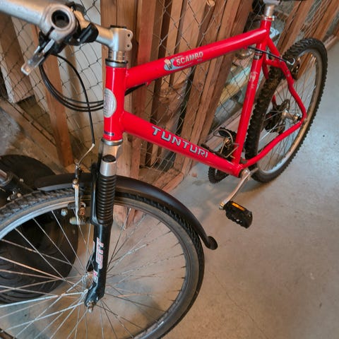 26 tuuman ilmaa pitävillä renkailla. Käsijarrut jotka molemmat toimii. Kaikki vaihteet ei pellaa koska vaijeri huono..mut ainakin kolme vaihdetta pelaa. Merkki on KHS COMP TRUE TEMPER. Shimanon vaihteet.