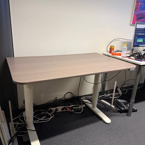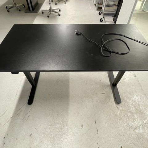IKEA sähköpöytä, jossa harmaa suorakulmainen pöytälevy ja valkoiset metallijalat. Pöydässä on sähkökäyttöinen korkeudensäätö, jonka ohjauspaneeli sijaitsee pöydän etureunassa. Pöytälevyn pinnassa on joitakin käytön jälkiä ja naarmuja. Sopii työpöydäksi tai kotitoimistoon, kun halutaan vaihdella työskentelykorkeutta istuma- ja seisoma-asennon välillä.
