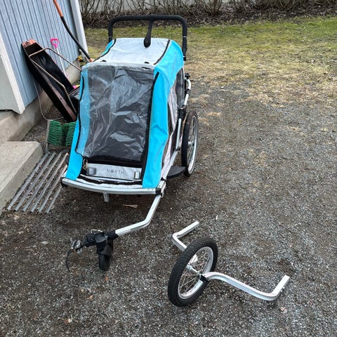 Lasten polkupyörän peräkärry kahdelle lapselle. Kärryssä on metallinen runko ja kaksi isoa pyörää. Sisällä on istuinosassa valjaat lapsille sekä selkänoja, jossa käyttöohjeet. Sivut ja etuosa ovat läpinäkyvää muovia, ja kankaassa on keltaisia ja tummia paneeleja. Vetokanki kiinnittyy polkupyörään, ja mukana on myös etupyörä, jonka avulla kärryä voi mahdollisesti käyttää työntökärrynä. Yhdessä sivussa on repeämä kankaassa. Soveltuu lasten kuljettamiseen polkupyörän perässä valmistajan ohjeiden ja painorajoitusten mukaisesti.