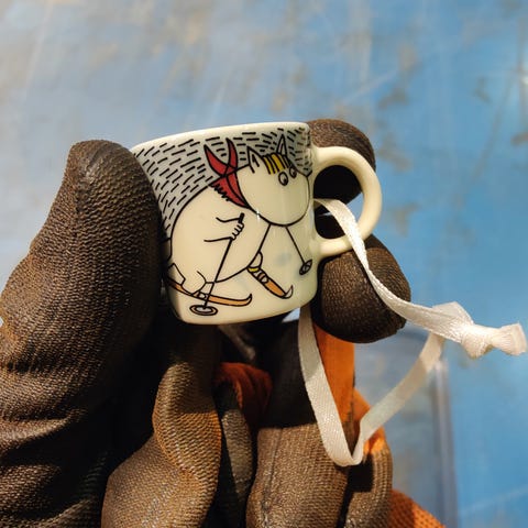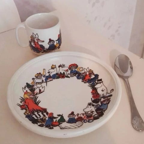 Arabia Muumi lasten astiasetti. Kuvioiduissa astioissa on Muumi-aiheiset kuvat, joista yksi lautanen on sinisellä ja toinen vihreällä pohjalla. Lisäksi settiin kuuluu läpinäkyvä muki, jossa on valkoinen Muumi-kuvitus. Soveltuu arki- ja ruokailuhetkiin lapsille.