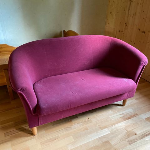 Hyväkuntoinen kolmen istuttava vuodesohva. Väri kuninkaallinen punainen. Materiaali plyysi ja puu tumma mahonki. Paljon käytetty mutta ei tämä vaan kulu miksikään. Tukeva, hyvä istua ja köllöttää. Vuodemekanismi toimii moitteetta.