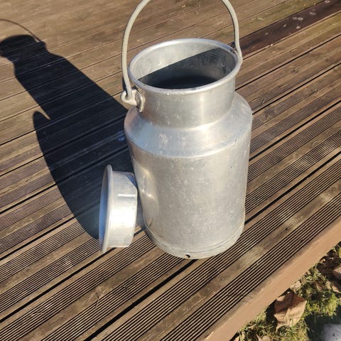 Vanha metallinen maitotonkka kannella. Valmistettu metallista, pinnassa käytön ja iän tuomaa patinaa. Tonkassa on molemmilla puolilla kantokahvat ja päällä irrotettava kansi. Sopii esimerkiksi säilytysastiaksi, koristeeksi tai pihalle ja mökille vanhan ajan esineeksi.