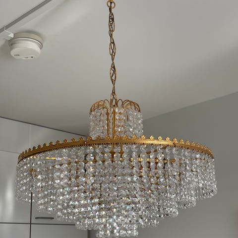 Hakusanat: kristalli, kristallinen, kristallikruunu, kristallit, hiottu, helmi, helmet, viivahiottu, klassinen tyyli, 6-valopistettä, kullansävyinen, koriste, lasi, kattovalaisin