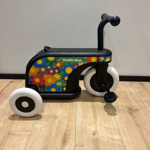Lasten mopo, jonka materiaali on pääosin muovia. Pyörässä on kolme pyörää ja on tukeva, joten se soveltuu pienille n.2-3 vuotiaalle lapsille tasapainon harjoitteluun ja pihaleikkeihin. Otsakkeen tuumakokoa en saanut muutettua...