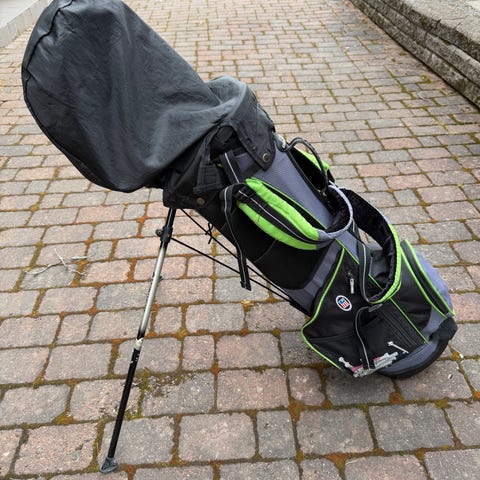 USKG 57 juniorien golfsetti, jalallinen kantobägi, paljon taskuja ja sade huppu. Grafiittivarrelliset 3driver, 6, 8 ja pitch. Metallivartinen putteri lyöntiä pehmentävällä insertillä. Mukaan todella lyhyt putteri ja pitchi vaikka pienemmälle sisarukselle. Soveltuu nuorelle pelaajalle golfin harjoitteluun ja pelaamiseen. Noin 9-12 vuotiaille ihanteellinen pituudesta riippuen, tarkoitettu noin 142-152 pituisille pelaajille. Käytetty hyvin vähän, 2 viikon pituista golfleiriä ja jokunen kerta rangella. Pistetään mukaan jokunen pallo ja tii niin valmiina suoraan kentälle pelaamaan