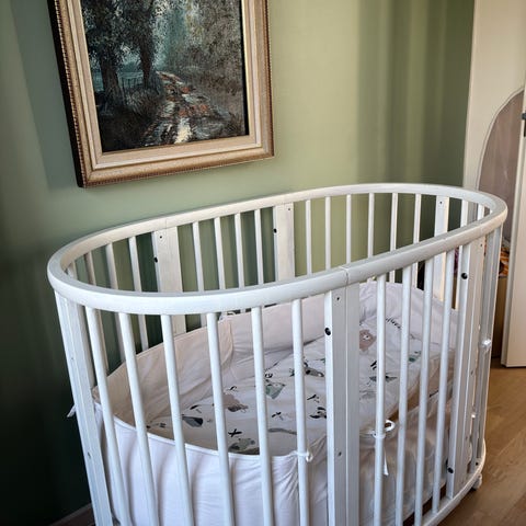 Stokke Sleepi V2 pinnasänky. Yleisilme siisti, ei hampaanjälkiä tms, hyvin pieniä kulumia kyllä, näistä kuva.