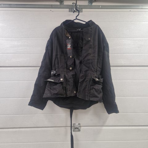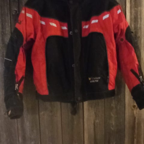 Rukka ajotakki Mp. Takissa on musta–punainen väritys ja heijastinnauhoja hihoissa ja selässä näkyvyyden parantamiseksi. Edessä on vetoketju ja tarrakiinnitys, vyötäröllä kiristysmahdollisuus. Materiaali on säänkestävään käyttöön suunniteltua tekstiiliä. Tämä jo retro iän puolesta mutta ehyt. Kivasti patinaa kiitenkin!