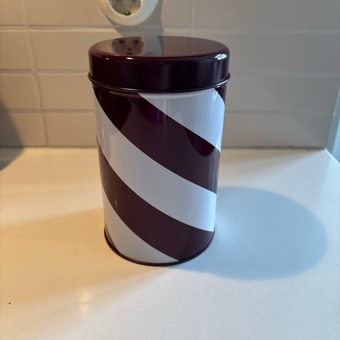 Aarikka peltirasia keittiöön tai säilytykseen. Ulkopinta on mustavalkoinen graafinen kuvio, sisäpinta metallinvärinen. Soveltuu esimerkiksi kuivien elintarvikkeiden tai pienten tavaroiden säilyttämiseen. Kaunis sisustuselementti. Korkeus 19 cm, pituus 14,5 cm ja leveys 11 cm.