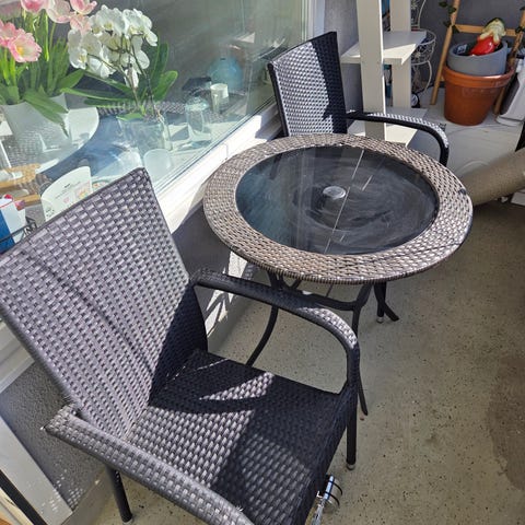 Myydään siisti puutarha-/parvekesetti. Jotain pieniä käytön jälkiä, mutta pääpiirteittäin suht siisti. Materiaali rottinkia, saa taitettua kätevästi pieneen tilaan.
