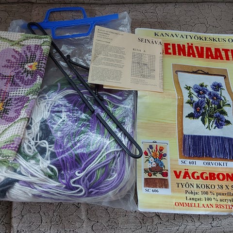 Kuultokudostarpeet. Kesä- kuultokuvapakkaus, joka sisältää kaiken tarvittavan, sekä pohjakangas punatulkkuaiheiseen kuultotyöhön.