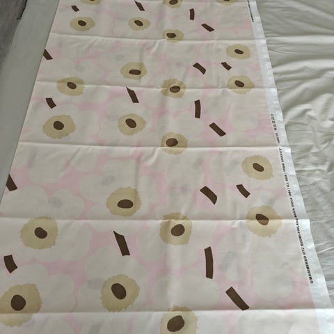 Marimekko Unikko kangas. Kuosissa suuret pinkin ja punaisen sävyiset kukat valkoisella pohjalla. Materiaalina puuvillakangas. Sopii esimerkiksi verhoihin, pöytäliinaksi, sisustustekstiileihin tai ompeluprojekteihin. Kankaan reunassa painettu Marimekko-merkintä.