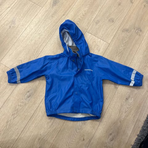 Didriksons -sadevaatteet kokoa 90. Ostettu uutena ja olleet yhdellä lapsella käytössä. Keltaisessa takissa on vähän tummentumaa, mikä näkyy kuvissa. Huomioitu hinnassa. Hyvä käytetty kunto.