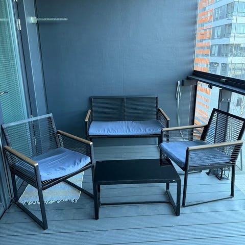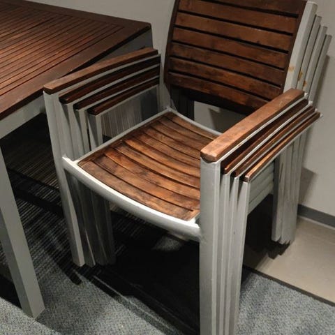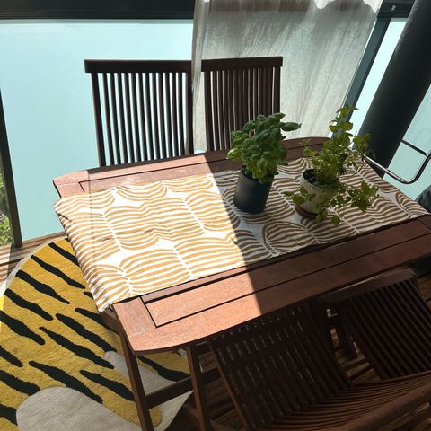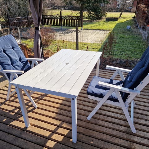 Neljä kasaanmenevää tuolia ja pöytä.Pöydän leveys 110 ja korkeus 75.
