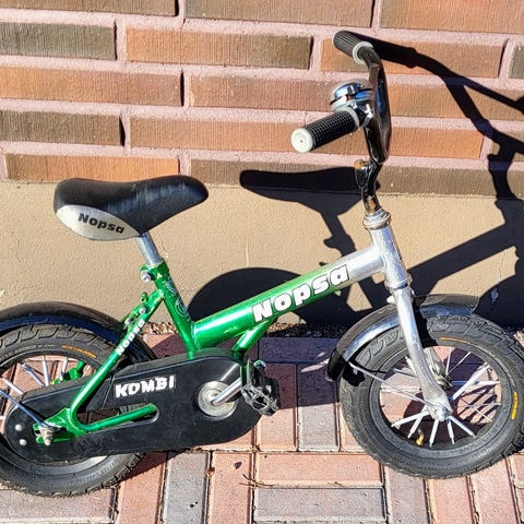 Lastenpyörässä on 12 tuuman renkaat ja matala runko, joka helpottaa kyytiin nousemista. Pyörässä on jalkajarru, lokasuojat edessä ja takana. Ohjaustangossa on suojapehmuste ja pyörässä on työntöaisa aikuiselle, mikä helpottaa lapsen opettelua ajamaan. Toimiva, mutta käytönjälkiä ja ruostetta löytyy.