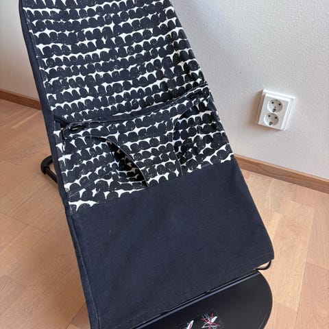 Babybjörn sitteri, väri tummansininen. Päällinen on irrotettava ja pestävä valmistajan ohjeiden mukaan. Useammalla lapsella hyvin palvellut, kangas antanut toisen kiinnikkeen kohdalta periksi mutta muutoin vielä toimiva. Runko hyvä kuntoinen vaikka vanhaa mallia, uudella kangasosalla varmasti myös hyvä.
