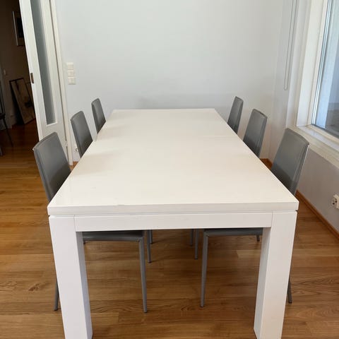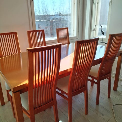 Myydään Vepsäläisen ruokapöytä 100cm×200cm. Pienellä entisöinnillä / maalauksella pöydästä saa upean! Laadukas, vankka pöytä. Lisäksi 8 kpl tuoleja. Skandinaaviset, laadukkaat tuolit ( korkeaselkäiset 6kpl) myös ostettu Vepsäläiseltä ja teetetty pestävät/ irroitettavat suojahuput designer guildin kankaalla. Pääty tuolien kankaat osittain rikki, itse tuolit ehjät. Voidaan myydä myös tuolit ja pöytä erikseen.